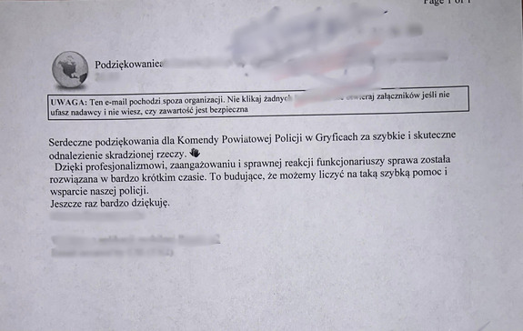 Pokrzywdzony dziękuje za szybkie i skuteczne działania funkcjonariuszy, które doprowadziły do odnalezienia skradzionego mienia oraz ustalenia sprawcy kradzieży.