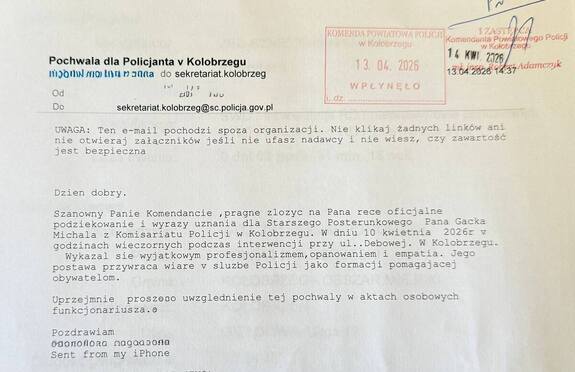 Na skrzynkę mailową Komendy Powiatowej Policji w Kołobrzegu trafiły kolejne wiadomości od mieszkańców, którzy chcieli podziękować za przeprowadzone interwencje. Takie sygnały pokazują, że codzienna służba funkcjonariuszy jest zauważana i doceniana.