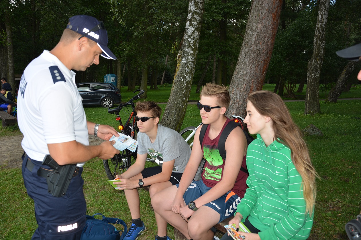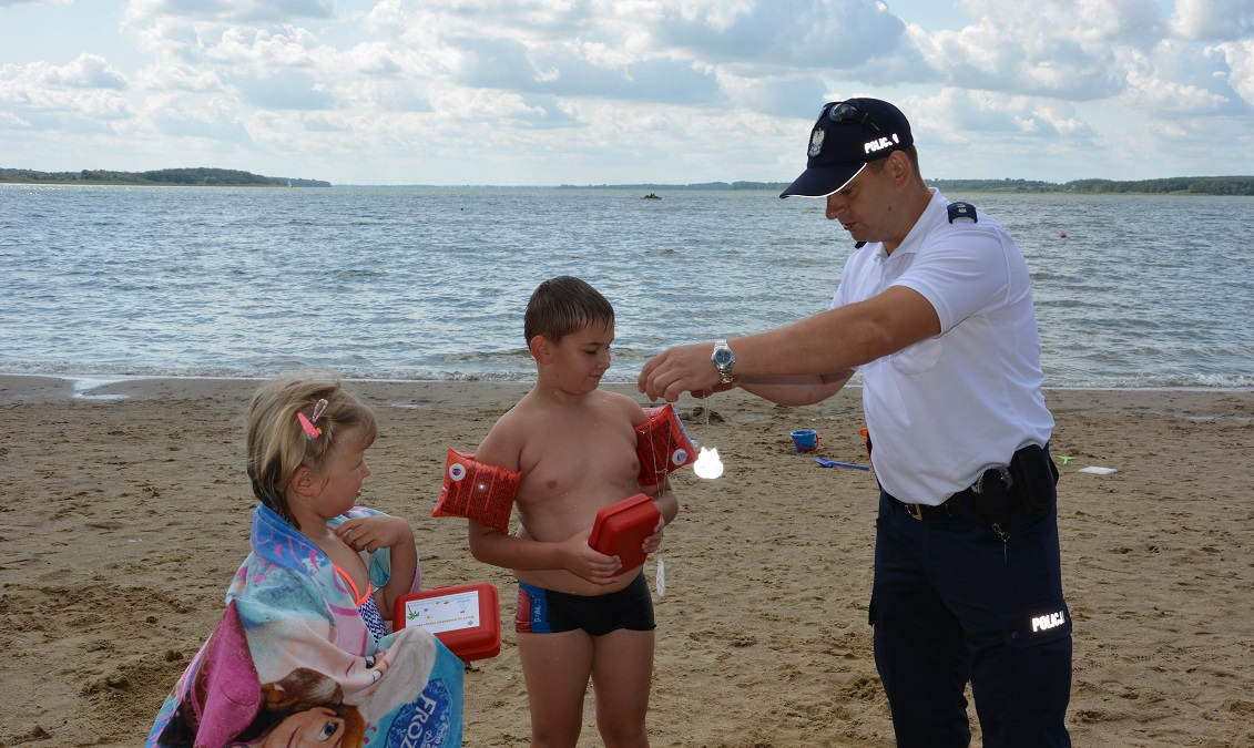 Funkcjonariusze z Komendy Powiatowej Policji w Stargardzie w ramach projektu „Wpłyń na wyobraźnię swoją i innych” rozmawiali z najmłodszymi wczasowiczami o bezpiecznych zachowaniach nad wodą. W trakcie prowadzonych działań oprócz wskazówek i informacji, policjanci przekazywali materiały edukacyjne w formie ulotek, a także dziecięcych apteczek pierwszej pomocy, które zawierają m.in. maskotkę – breloczek, maseczkę do resuscytacji oraz książeczkę informacyjną dla dziecka i rodzica.