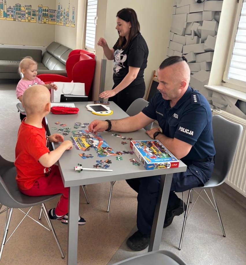 od razu wywołały uśmiech na twarzach najmłodszych. Funkcjonariusze opowiedzieli także o swojej codziennej służbie. Dużo radości sprawiła także wspólna zabawa – dzieci wraz z policjantami układały puzzle, co stało się okazją do rozmów, żartów i chwil wytchnienia od codziennych trudności.