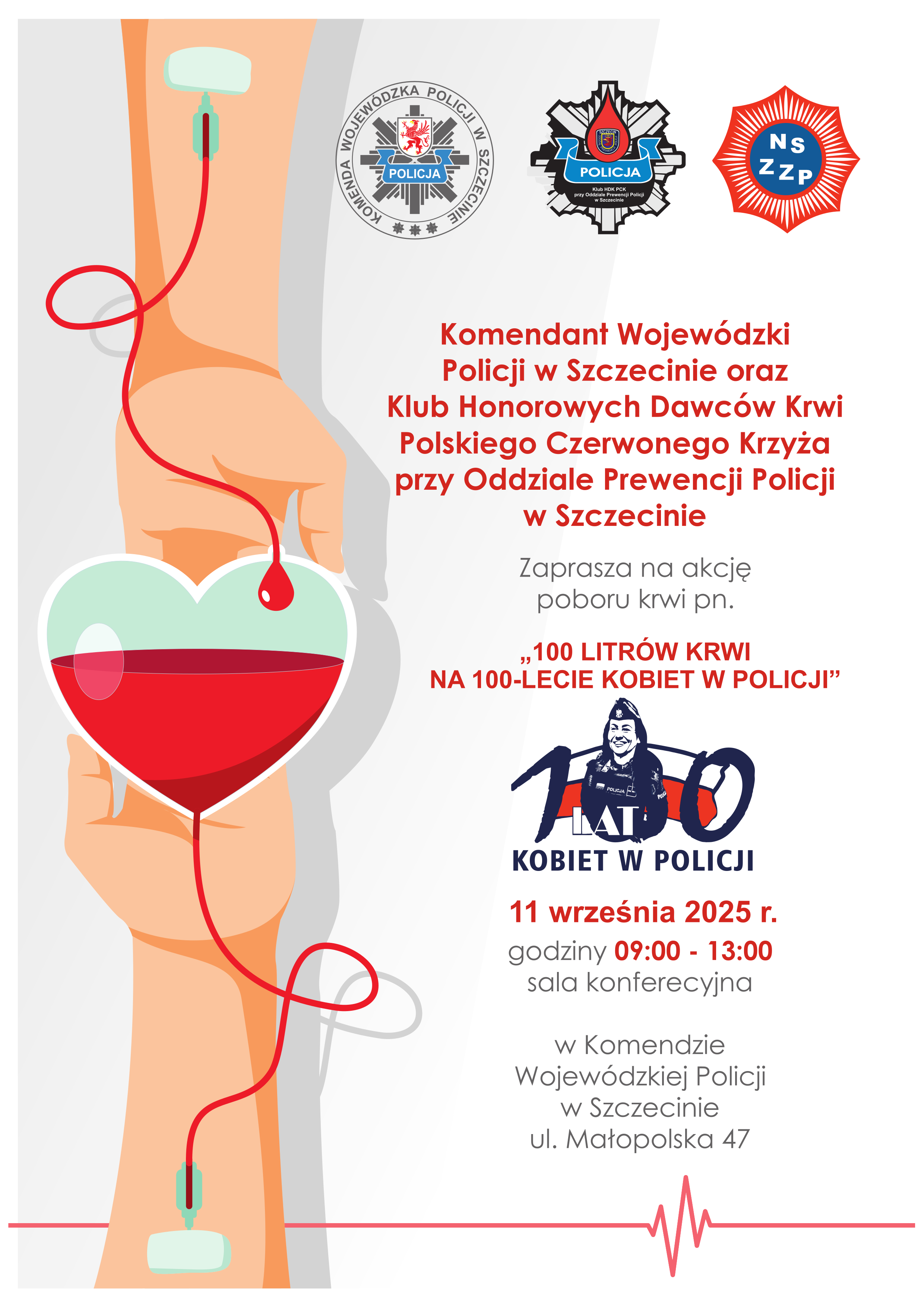 Rok 2025 to wyjątkowy jubileusz – 100-lecia obecności kobiet w szeregach polskiej Policji. Z tej okazji Komendant Wojewódzki Policji w Szczecinie oraz Klub Honorowych Dawców Krwi PCK działający przy Oddziale Prewencji Policji w Szczecinie zaprasza na akcję poboru krwi. Idea jest jedna, niesienie bezinteresownej pomocy innym.