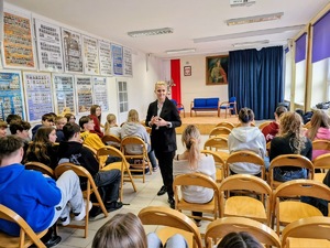 Funkcjonariuszka Szczecińskiego Zarządu CBZC zapoznała młodzież z zagrożeniami dotyczącymi poruszania się w przestrzeni internetowej, korzystania z komunikatorów, aplikacji i kont e-mailowych. W trakcie dyskusji uczniowie mogli usłyszeć o mechanizmie związanym z hejtem i niebezpiecznym zachowaniami w Internecie, a także o konsekwencjach prawnych i wymiarze psychologicznym.