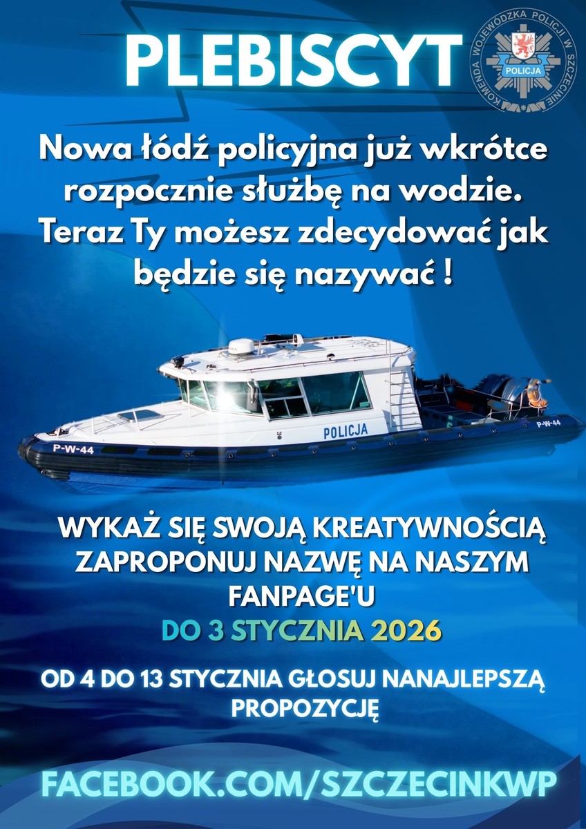 Witajcie miłośnicy marynistyki i nowoczesnego sprzętu pływającego! Ogłaszamy plebiscyt na nazwę dla nowej łodzi Komisariatu Wodnego Policji w Szczecinie. Aby wziąć udział w naszej akcji, wystarczy odrobina kreatywności i nieograniczona wyobraźnia. Umieść swoją propozycję w komentarzu naszego posta na platformie Facebook. Nie możemy się doczekać Waszych propozycji. Nagrodą dla zwycięzcy będzie rejs łodzią po akwenie Odra-Dąbie oraz symboliczny tytuł matki/ojca chrzestnego jednostki. Dołącz do zabawy i weź udział w naszym konkursie.
