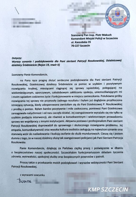 Do Komisariatu Policji Szczecin - Śródmieście wpłynęły wyjątkowe podziękowania, które są najlepszym dowodem na to, jak ważną rolę w lokalnej społeczności odgrywają dzielnicowi. Autorka listu skierowała słowa uznania do sierżant Patrycji Roszkowskiej, podkreślając jej profesjonalizm, zaangażowanie oraz empatyczne podejście do mieszkańców.